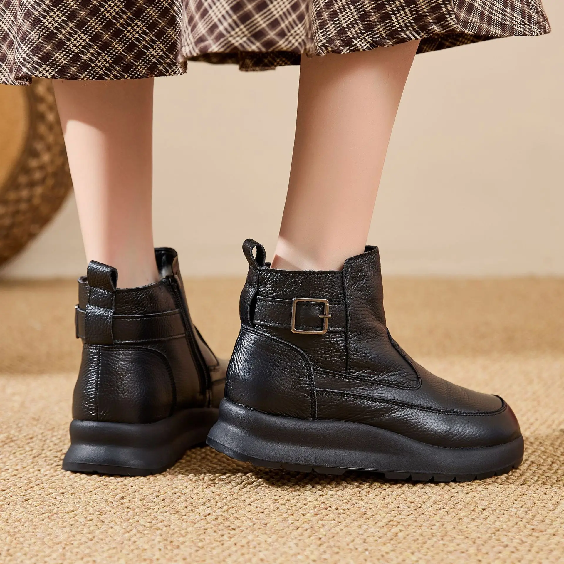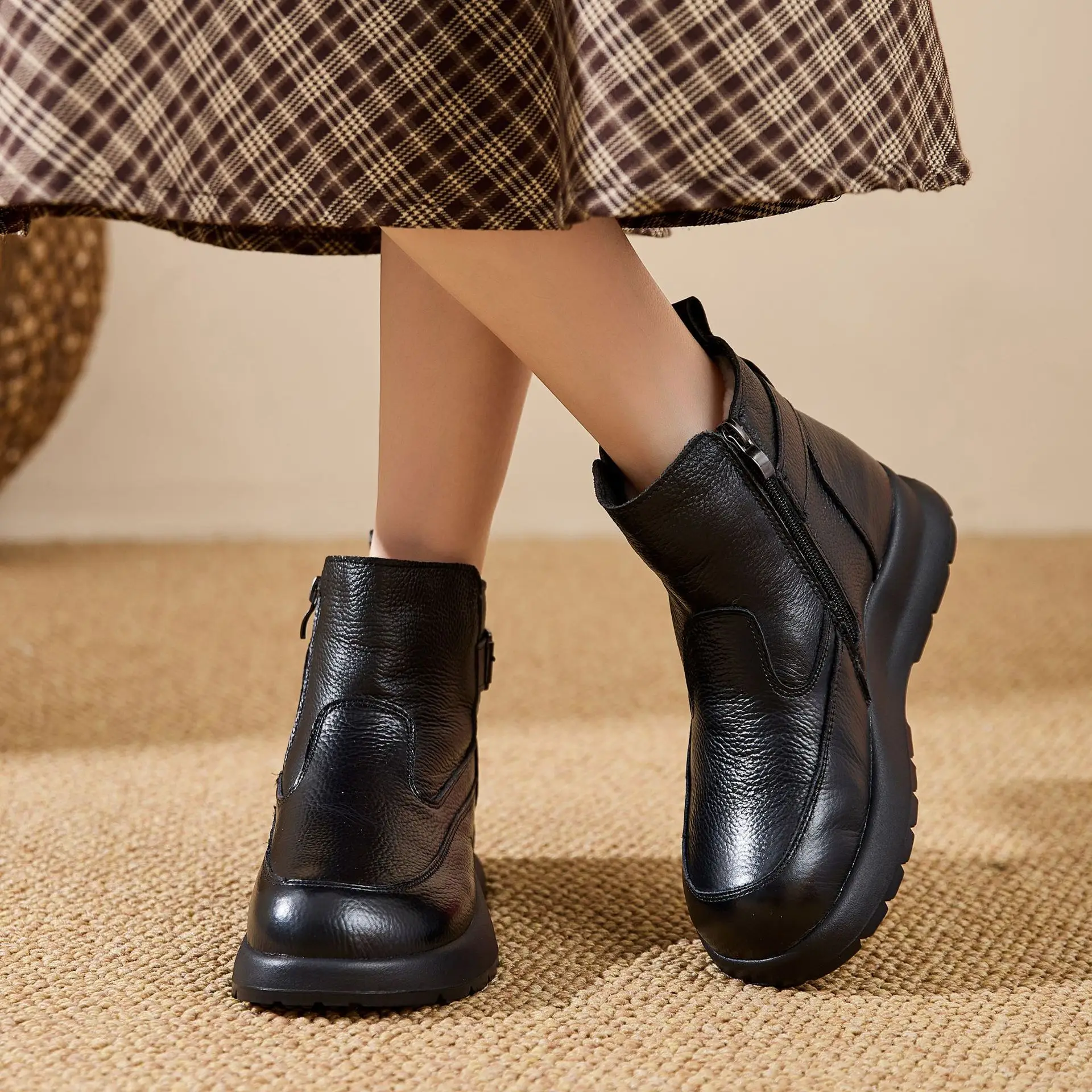 Thick-soled Warm Short Boots Big Size 41 Wool Inside Cowhide Mom Shoes Winter Cotton Shoes Soft Sole Women's Shoes Zipper