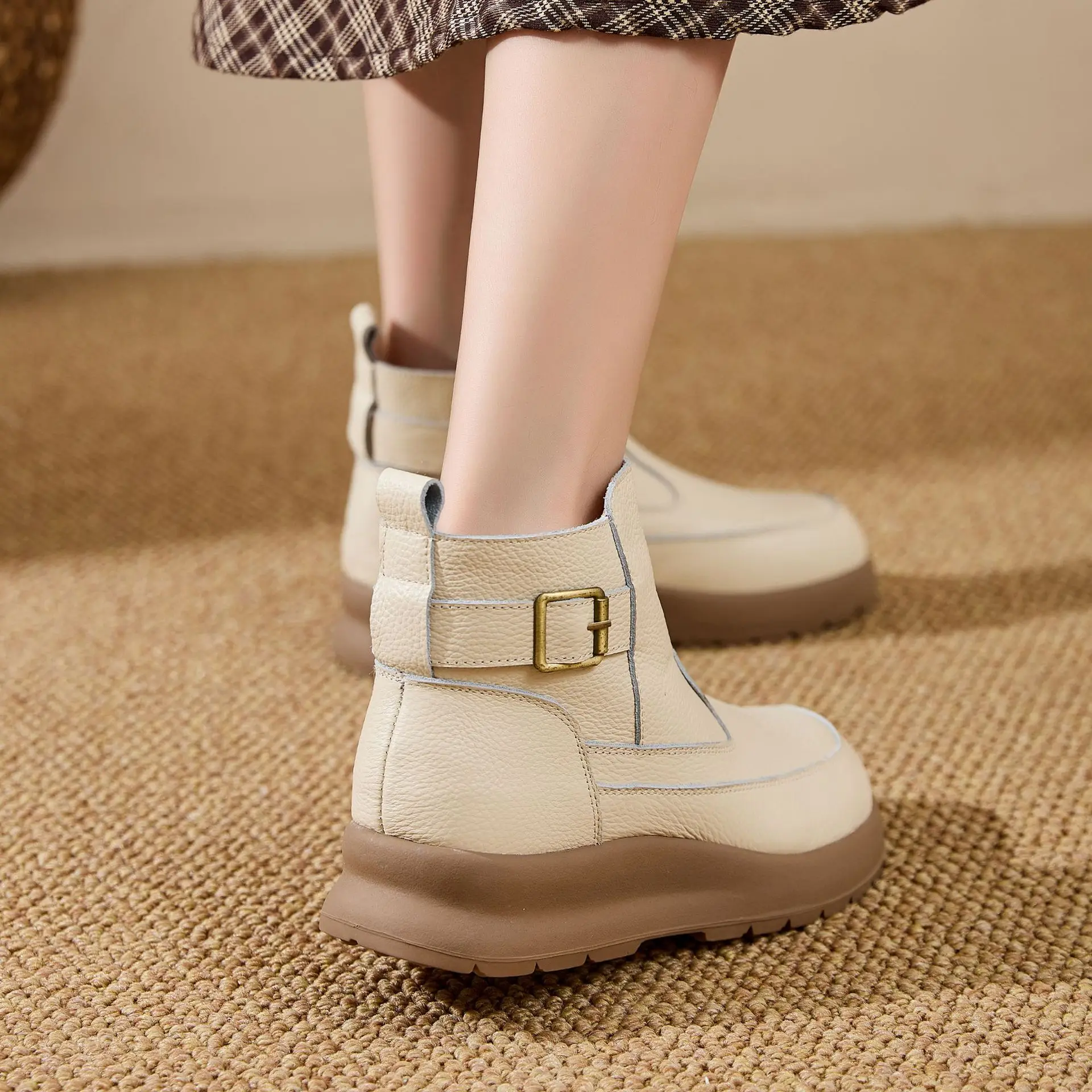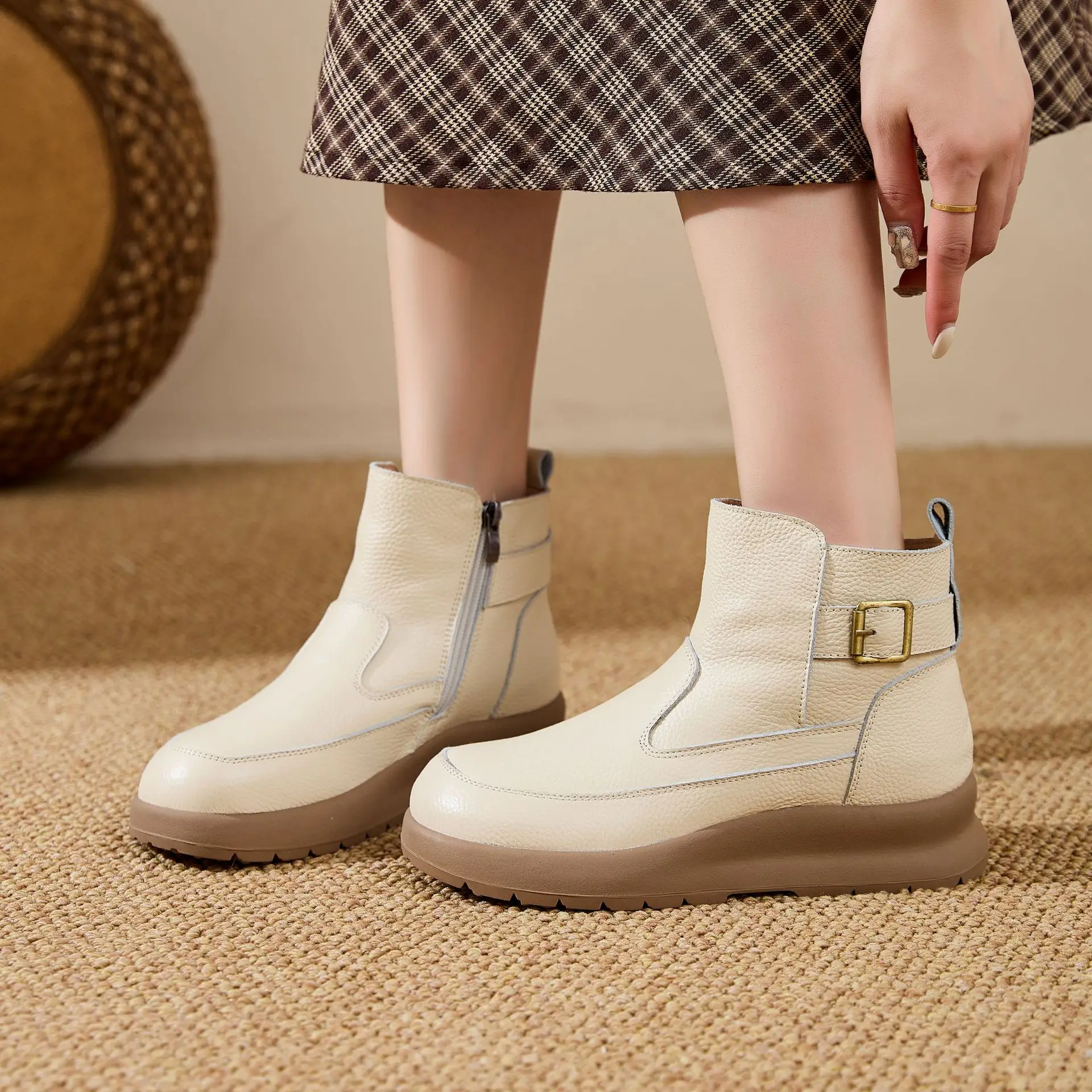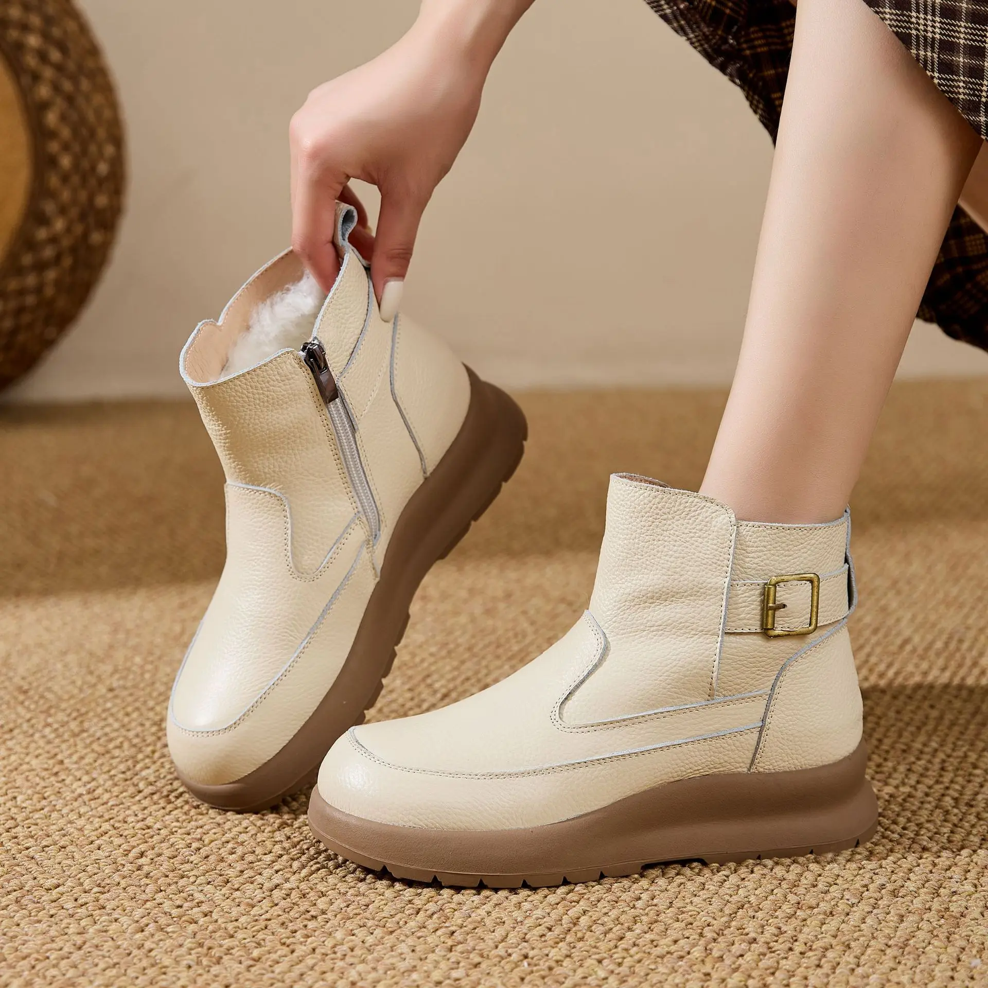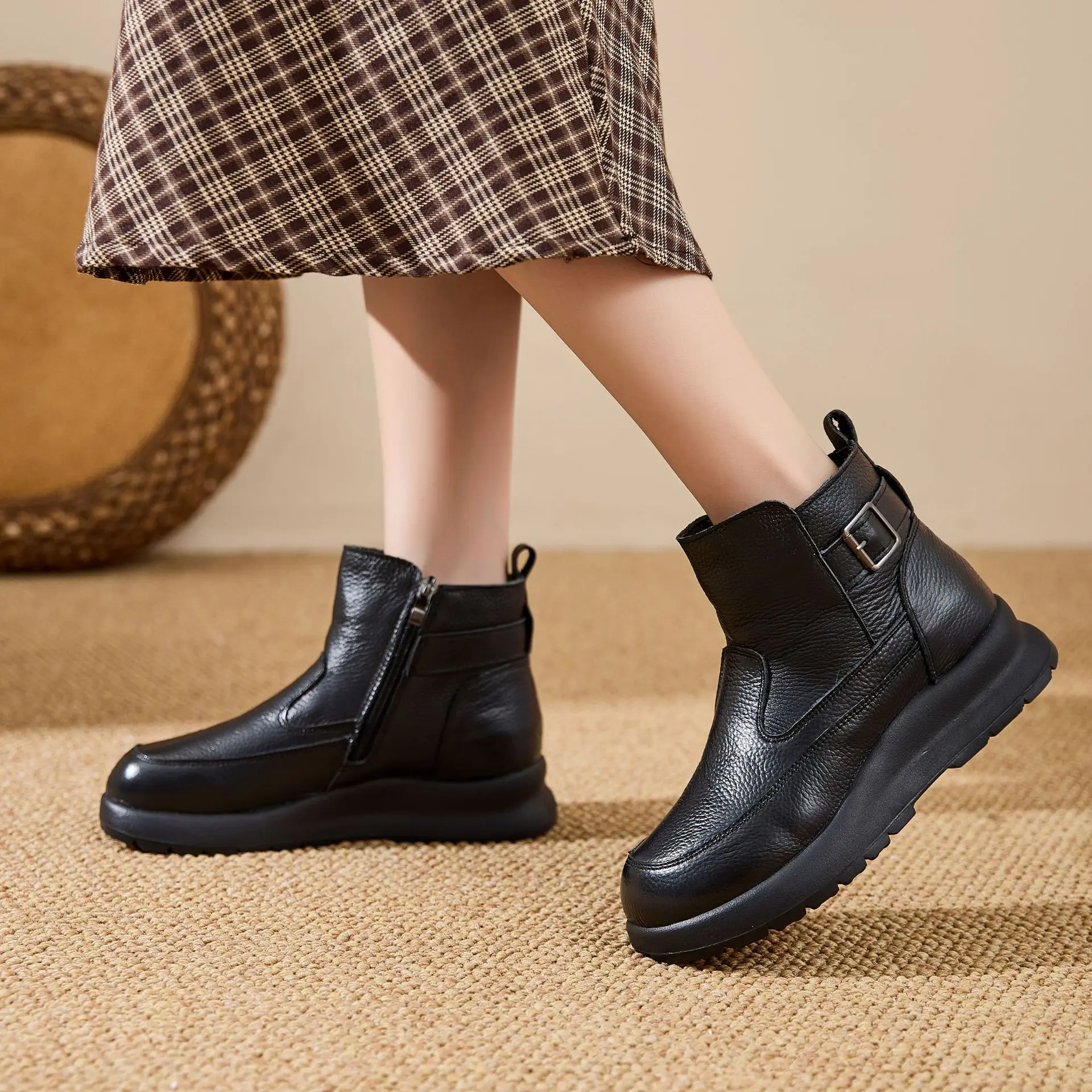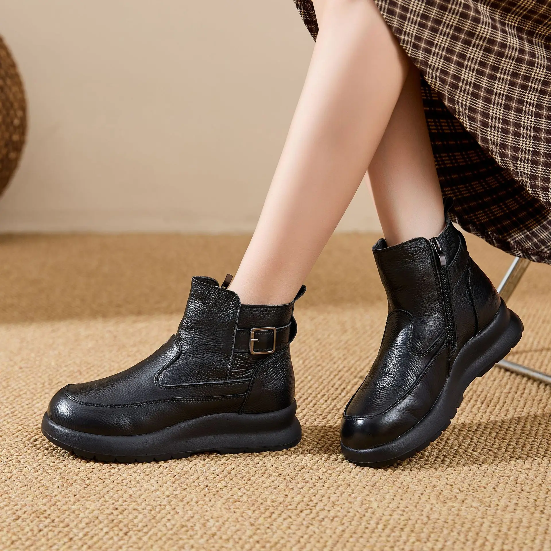 Thick-soled Warm Short Boots Big Size 41 Wool Inside Cowhide Mom Shoes Winter Cotton Shoes Soft Sole Women’s Shoes Zipper