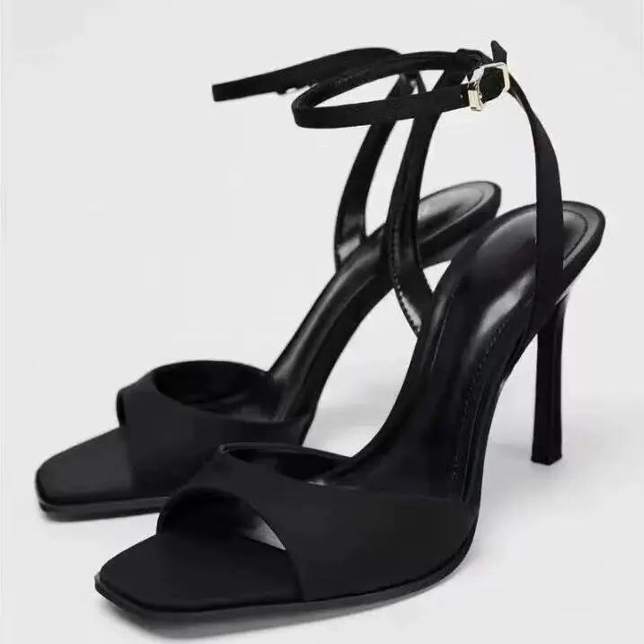 TRZA Women's shoes, black snake pattern, stylish high heels, slim heels, sexy square toe women's sandals