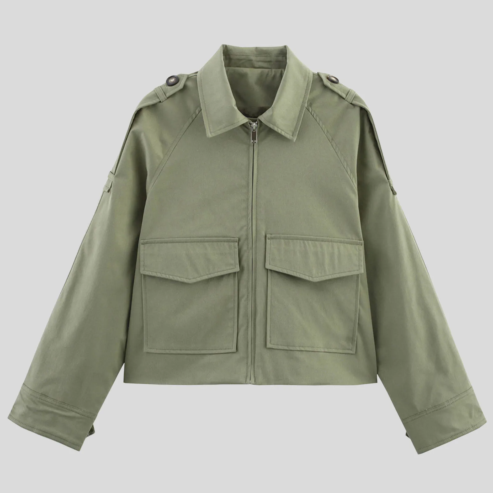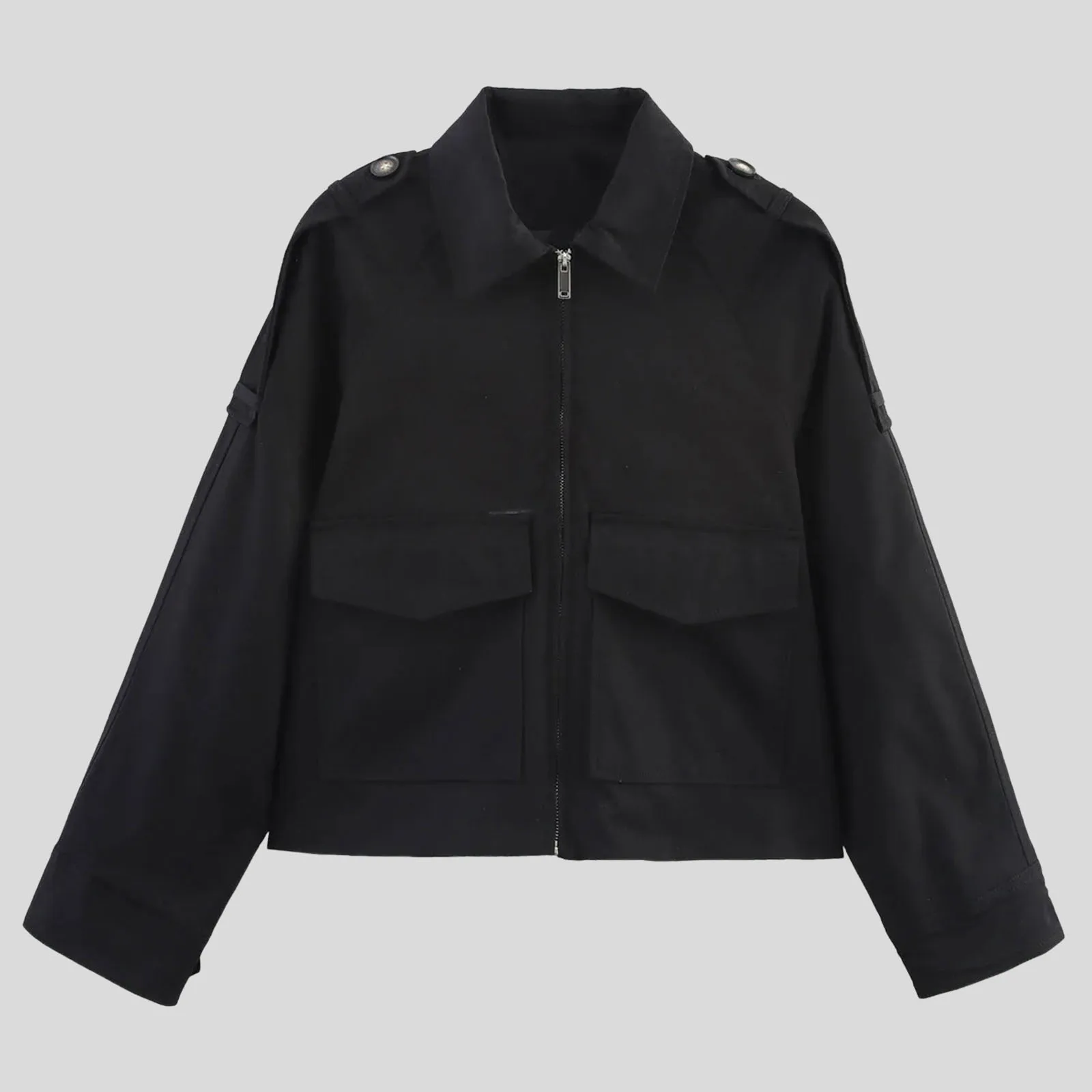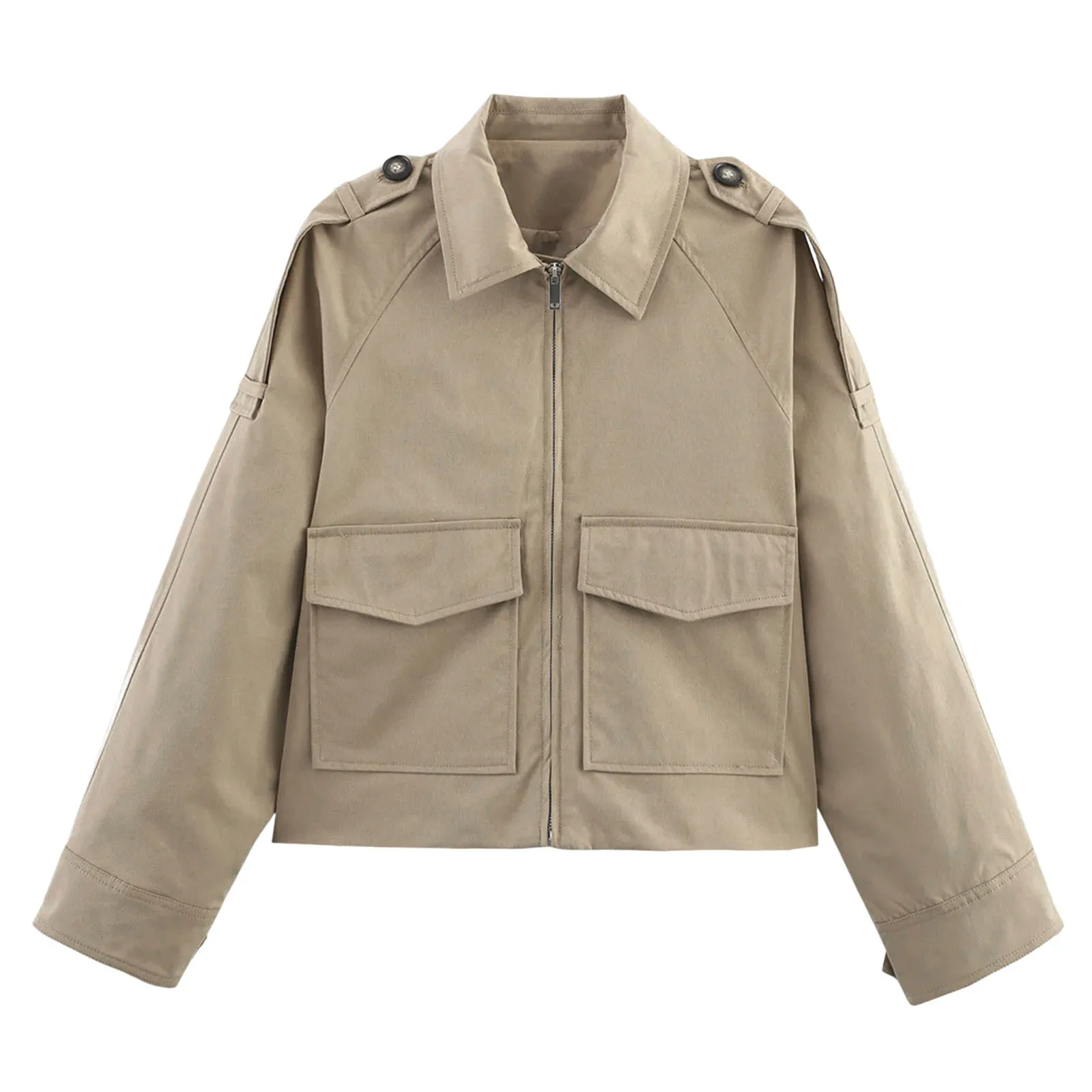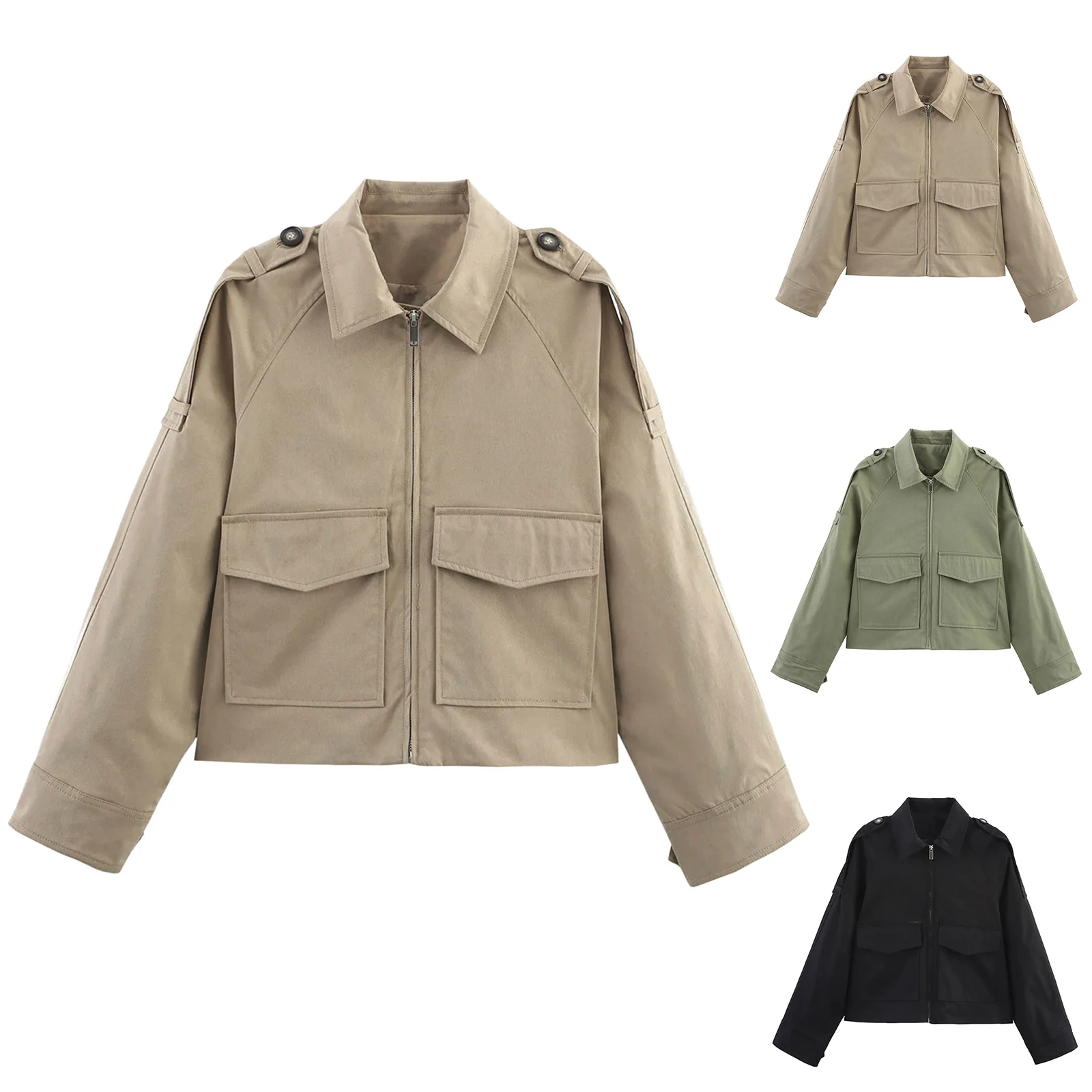 Vintage Women's Short Jackets Streetwear Solid Laple Pockets Full Sleeve Zipper Coats Female Autumn Winter Khaki Black Outwear