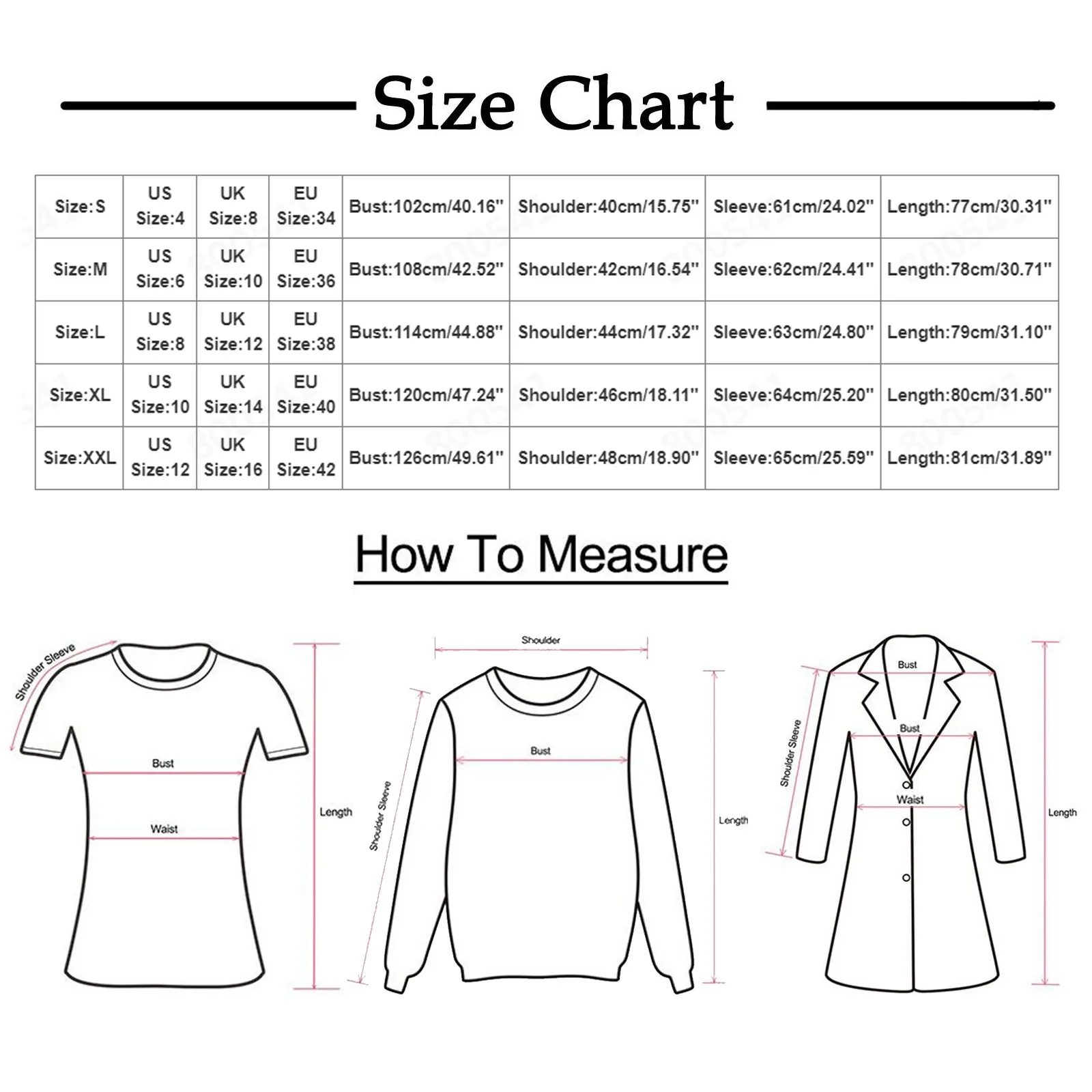 Size:XL US Size:10 UK Size:14 EU Size:40 Bust:120cm/47.24” Shoulder:46cm/18.11” Sleeve:64cm/25.20” Length:80cm/31.50”
